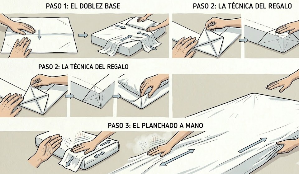 - El Planchado a Mano: Humedece ligeramente tus palmas y pásalas con fuerza sobre la tela tensada. Esto elimina las arrugas del doblez y asienta la forma.