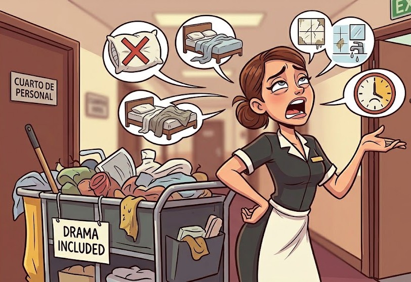 Entra por la puerta del hotel y, antes de dar los buenos días, ya ha soltado el primer suspiro de drama. Que si el uniforme pica, que si el carrito tiene una rueda rebelde, que si el café de la máquina hoy sabe “raro”.